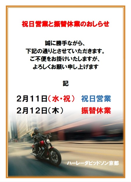 2月11日(水・祝)は祝日営業となり、翌木曜日が振替休業となります。