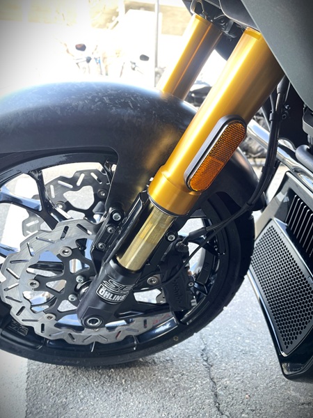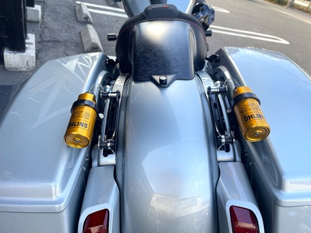 スクリーミンイーグルとオーリンズのダブルネームリアショックユニット。