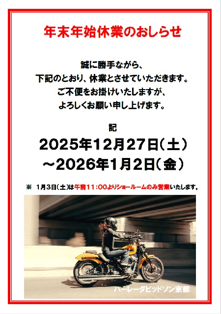 年内営業は26日(金)まで、年始は2026年1月3日11時よりオープンとなります。