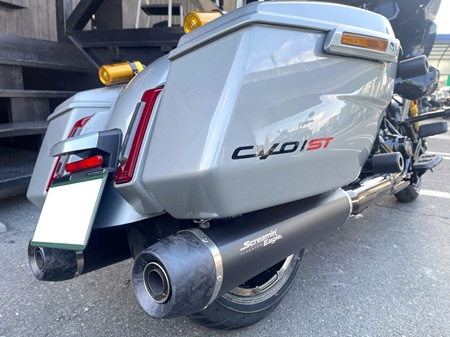 上部に露出したリザーバータンク装備状態で、左右のサドルバッグリッドの開閉、シーシーバーやツアーパックキャリアの同時装着が可能です。