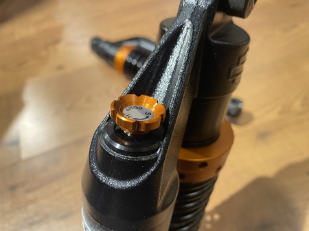 プリロードアジャスターダイヤルは、ハーレーカラーのオレンジアルマイト。
